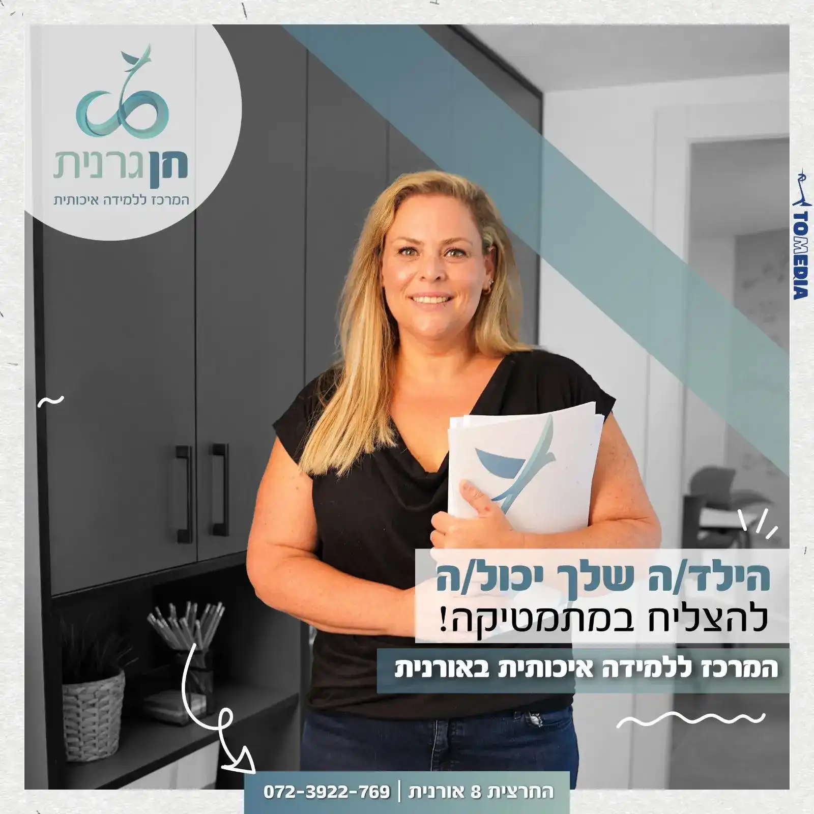 מרכז חן גרנית הוא מרכז למידה ייחודי המתמחה בהוראת מתמטיקה לתלמידי ותלמידות כיתות ה’ עד י”ב. המרכז ממוקם באורנית ופועל בקבוצות קטנות של עד 7 תלמידים, המאפשרות יחס אישי, תמיכה מותאמת, ולמידה אפקטיבית לכל תלמיד בהתאם לצרכיו. את המרכז הקימה חן גרנית – בעלת תואר ראשון בחינוך מיוחד והוראת מתמטיקה, ותואר שני בניהול ומנהיגות בחינוך, עם ניסיון עשיר של 16 שנים בהוראה ובניהול חינוכי. חן מלמדת מתוך תשוקה אמיתית למתמטיקה, עם ראייה חינוכית רחבה ויכולת לזהות את הדרך המדויקת לעזור לכל תלמיד לפרוץ קדימה. בזכות ההיכרות המעמיקה שלה עם מערכת החינוך, היא מכינה את תלמידיה להצלחה בבחנים, במתכונות ובבגרויות, תוך דגש על חיזוק הביטחון העצמי והאמונה שהם יכולים להצטיין. המרכז מהווה בית חם, מכיל ותומך, שמעניק תחושת שייכות וקהילה.